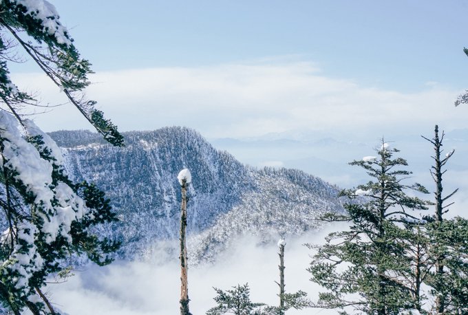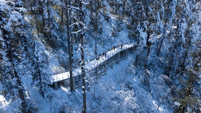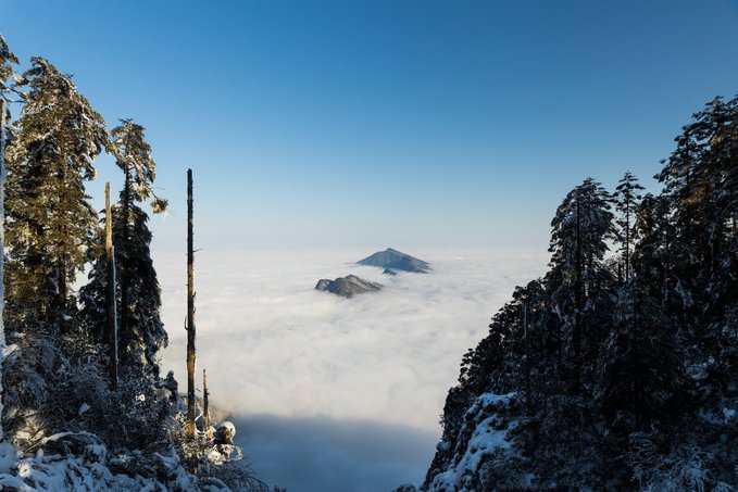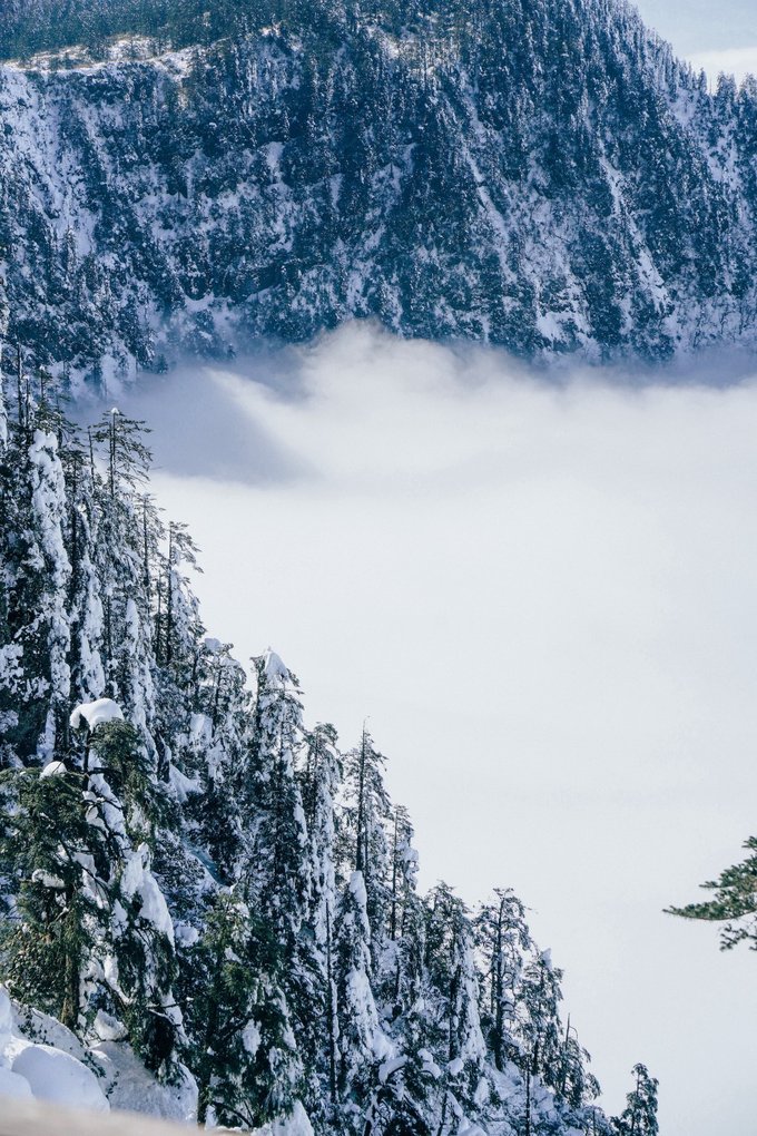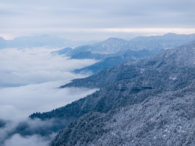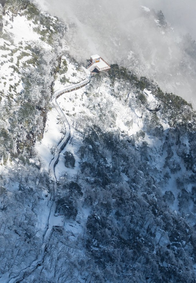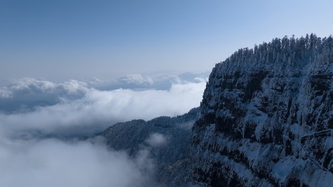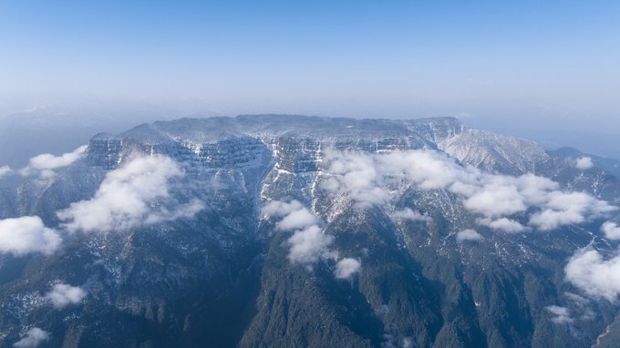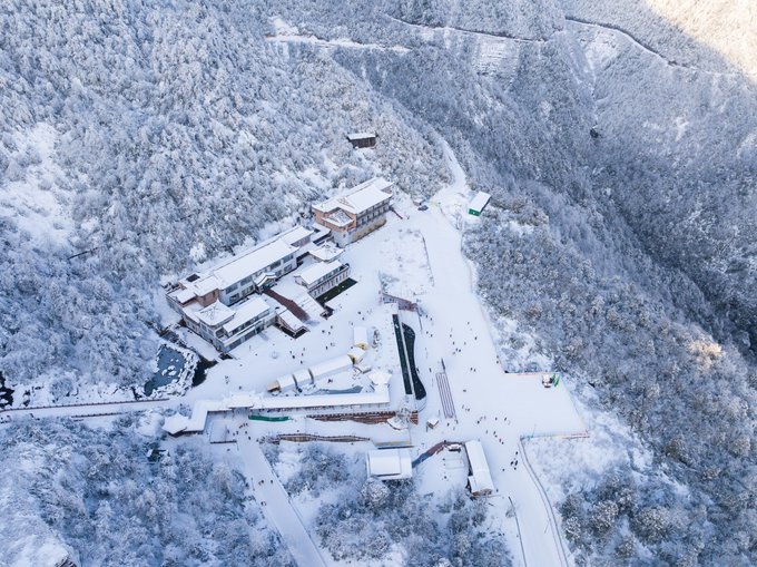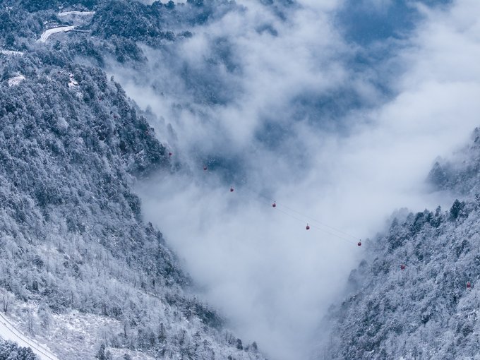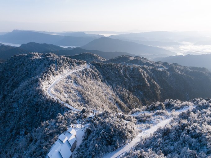 这个冬天,我已经悄悄去了两次瓦屋山,一次大雾,一次放晴。 截然不同的天气,却都没让我失望,晴雨雾霭都像老天爷给瓦屋山施下的魔法,让我远离城市,在云端之上做足了自由的深呼吸。 ▼航拍瓦屋山雪景