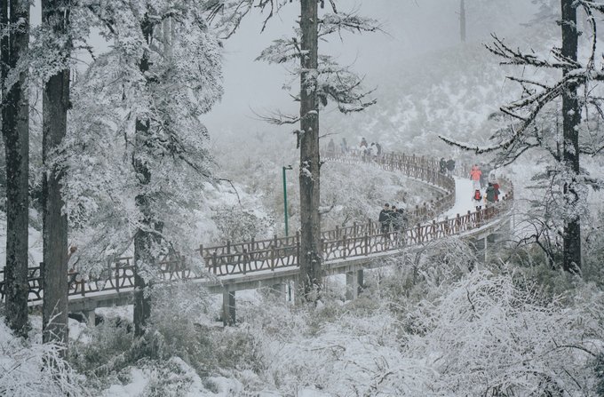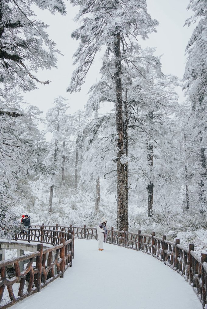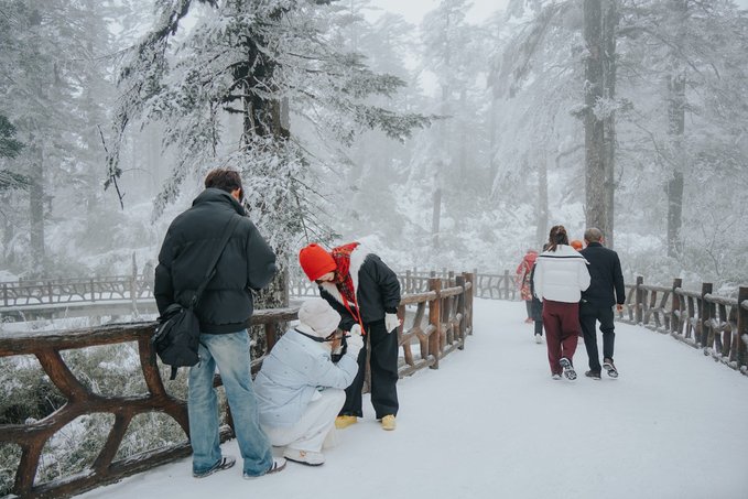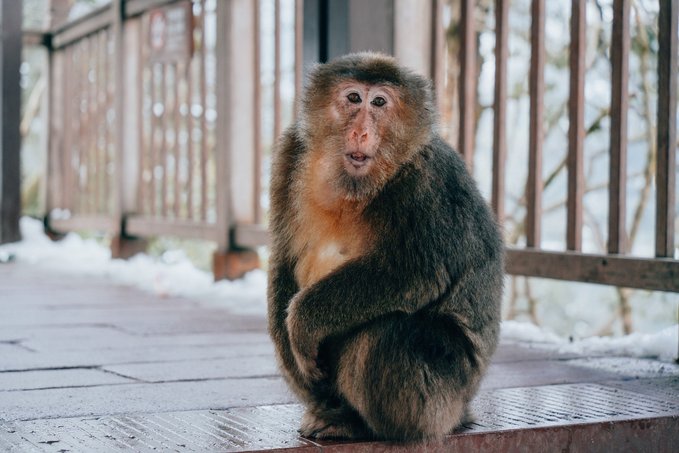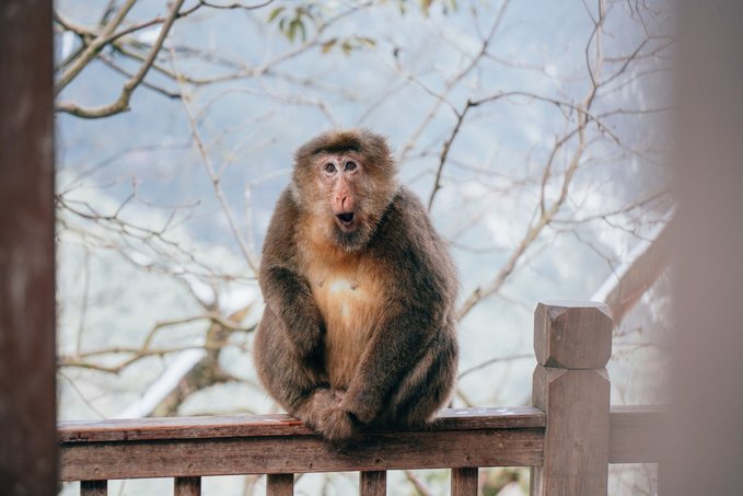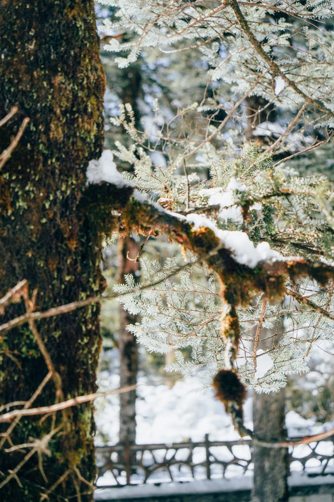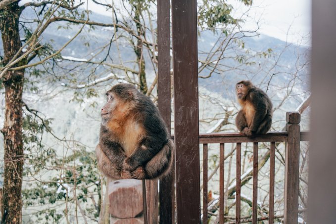 瓦屋山的生物多样性远超我的预期。 珙桐林里的鸽子花、不同种类的苔藓我不会辨别,但活蹦乱跳的小动物我当然不会错过。 运气很好,入园第一时间就遇到可爱的猴群,它们可比峨眉山的“前辈”们矜持得多,要么在人行道上慢条斯理地吃东西,要么蹲在栈道扶手上悠哉悠哉地看雪,不会因为游客经过就一惊一乍的,完全是一副“见过世面”的样子。