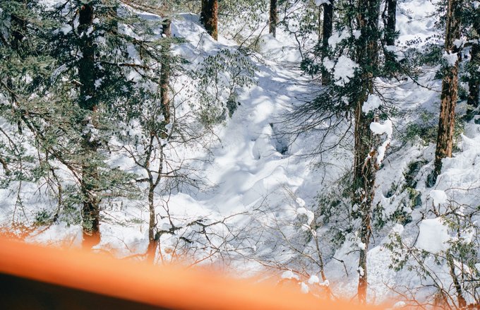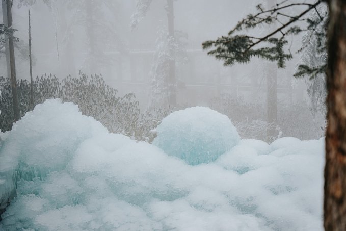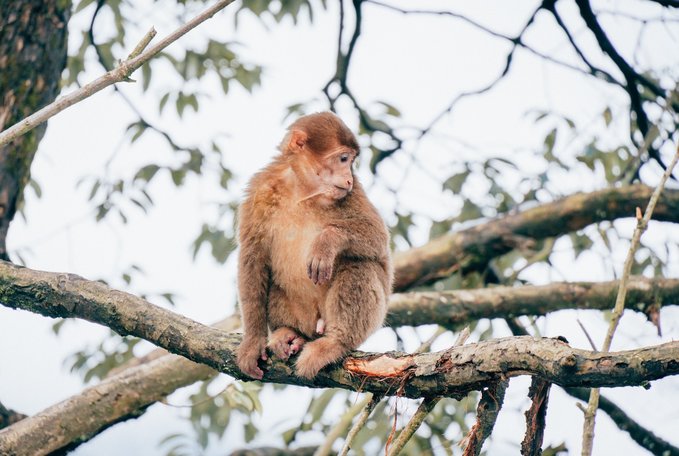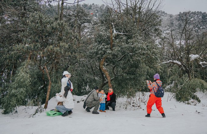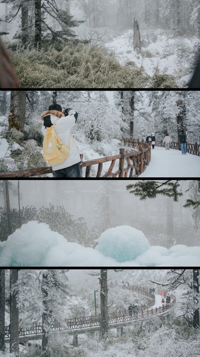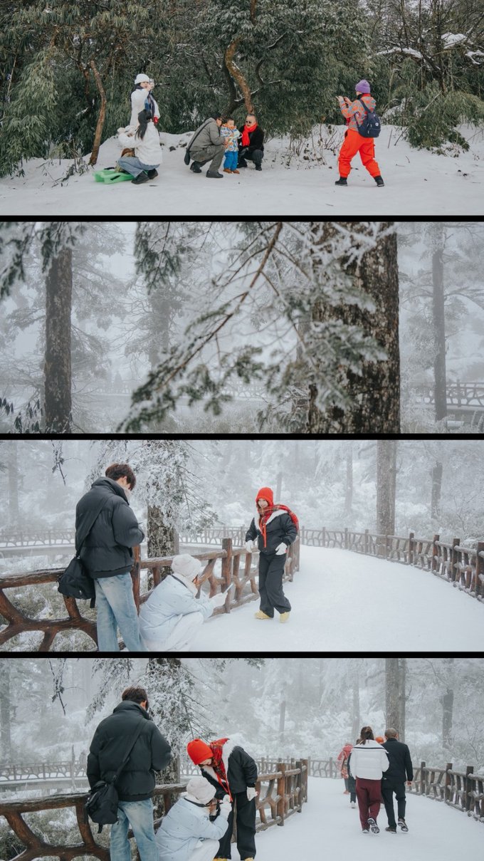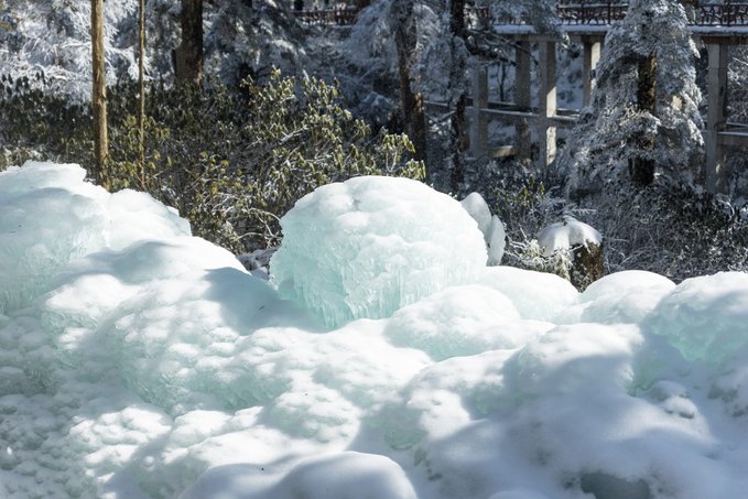 瓦屋山的生物多样性远超我的预期。 珙桐林里的鸽子花、不同种类的苔藓我不会辨别,但活蹦乱跳的小动物我当然不会错过。 运气很好,入园第一时间就遇到可爱的猴群,它们可比峨眉山的“前辈”们矜持得多,要么在人行道上慢条斯理地吃东西,要么蹲在栈道扶手上悠哉悠哉地看雪,不会因为游客经过就一惊一乍的,完全是一副“见过世面”的样子。