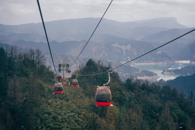 随着第二乘索道带来的巨大的高度爬升,所见已与山脚截然不同。 缆车越升越高,阳光刺破云层,瓦屋山桌山平台的轮廓逐渐清晰,这是一块被造物主遗忘在四川盆地的“天空棋盘”。 走出索道站,不到几百米便是西眺贡嘎观景台,远处的贡嘎雪山与峨眉山在晴空下若隐若现,仿佛天地间最沉默的守望者。 山顶的鸳鸯池有故事也有惊喜:当正午时分,阳光直射湖面,会有传说中“三个太阳”的奇观 —— 天上一个,水中一个,第三个光斑诡异地悬在游客的睫毛边缘……