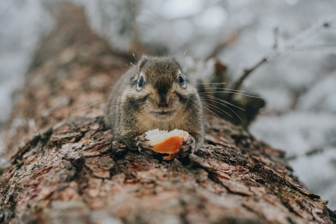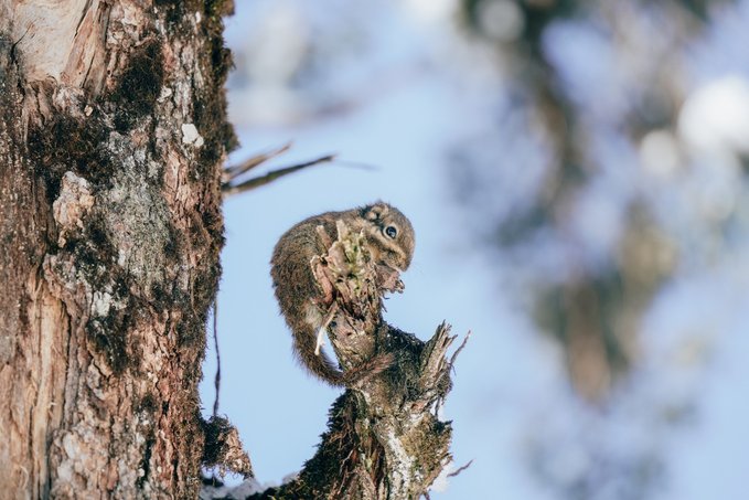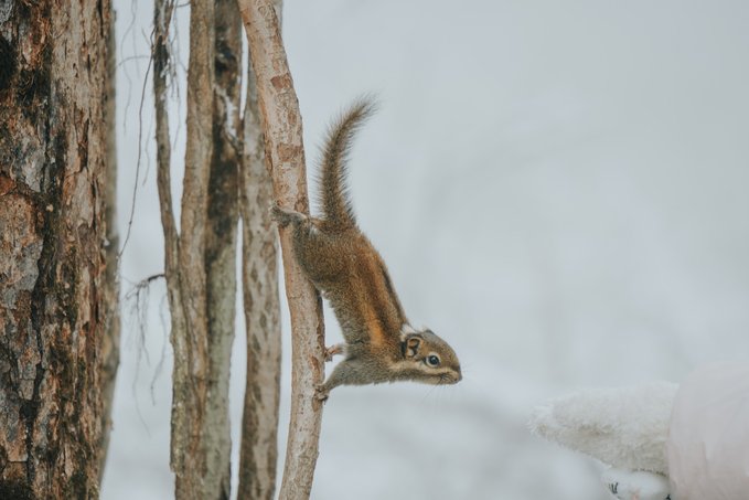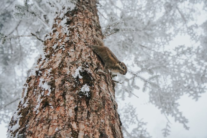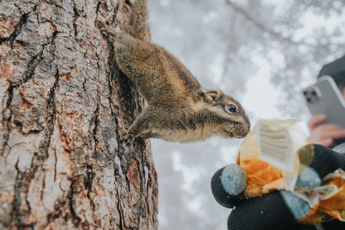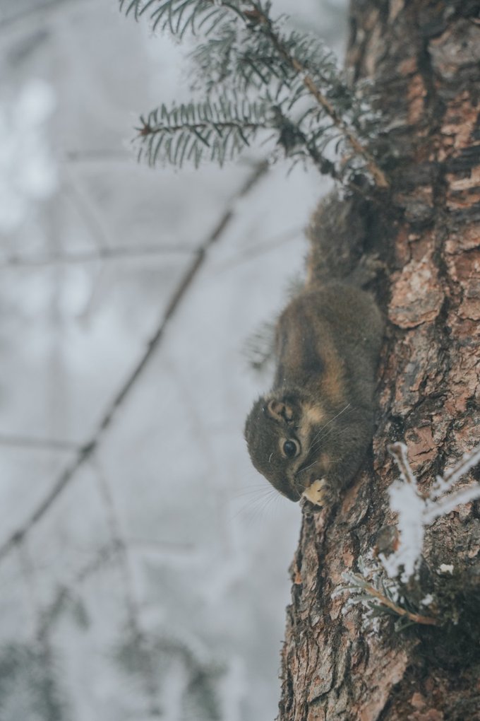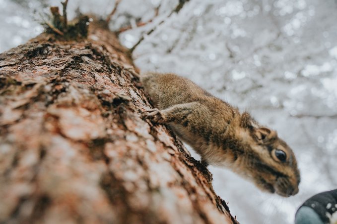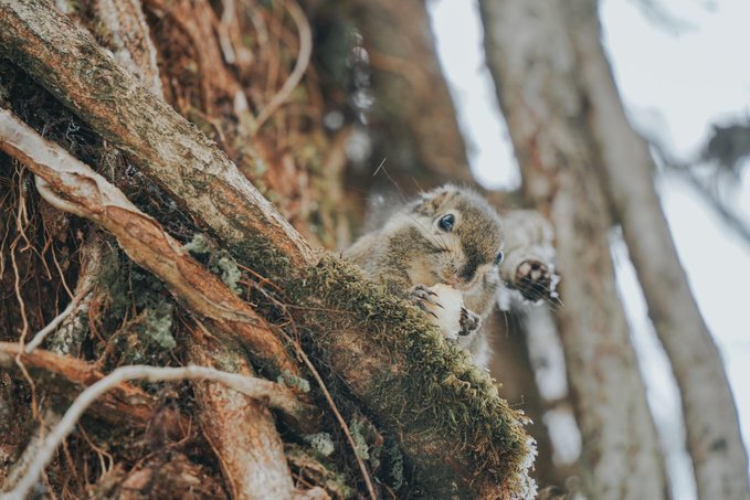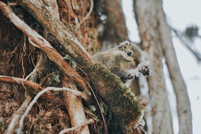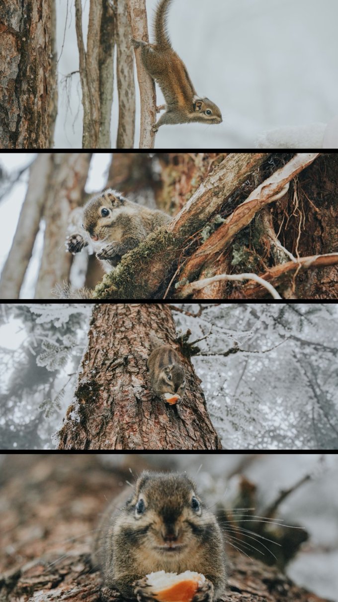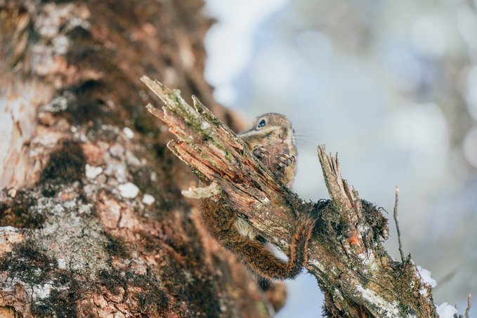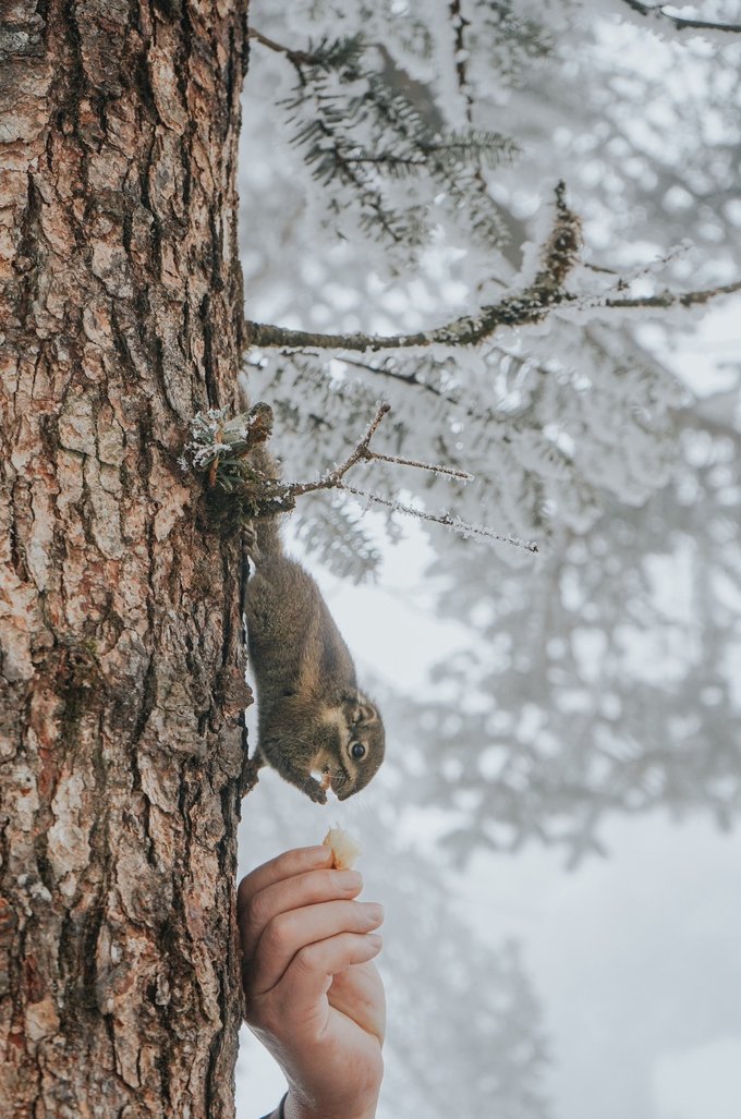 而不怯场的松鼠,更是会与你不期而遇! 当你漫步栈道,常常会听见头顶传来窸窸窣窣的碎响,抬头一看便是蓬松着尾巴的森林“外交官”。 总有游客掏出提前准备好的食物挑逗它们,这些小家伙也深谙交易的艺术,每叼走一颗食物,就表演一段迅雷不及掩耳的“悬崖速降”。当你举起相机,它们早跑没影儿了,你只能耐心地默默蹲守…… (Tips:投喂野生动物可能破坏生态,建议用镜头代替食物与山灵互动)