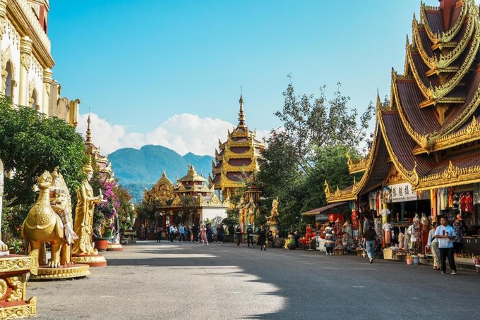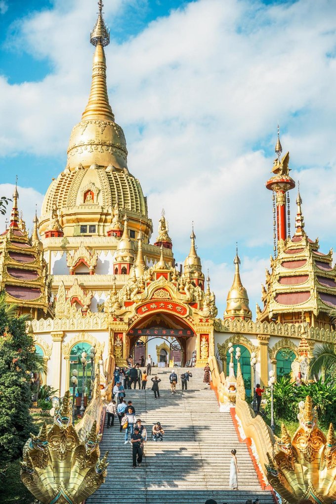 虽然今年无缘泼水节,但芒市依然有超多值得打卡的地方! ✔勐焕大金塔 勐焕大金塔是芒市的标志性建筑,坐落于雷牙让山巅,是中国第1️⃣金佛塔、亚洲第1️⃣空心佛塔,塔高76米,气势恢宏。阳光下,通体金黄、熠熠生辉,南亚傣王宫风格尽显庄重神圣。在此既能感受浓厚佛教氛围,又能俯瞰芒市全景。 门票:参考价40元 开放时间:08:00 - 22:00(傍晚前往最佳,可赏落日余晖下的金色塔身与华灯初上的璀璨夜景)