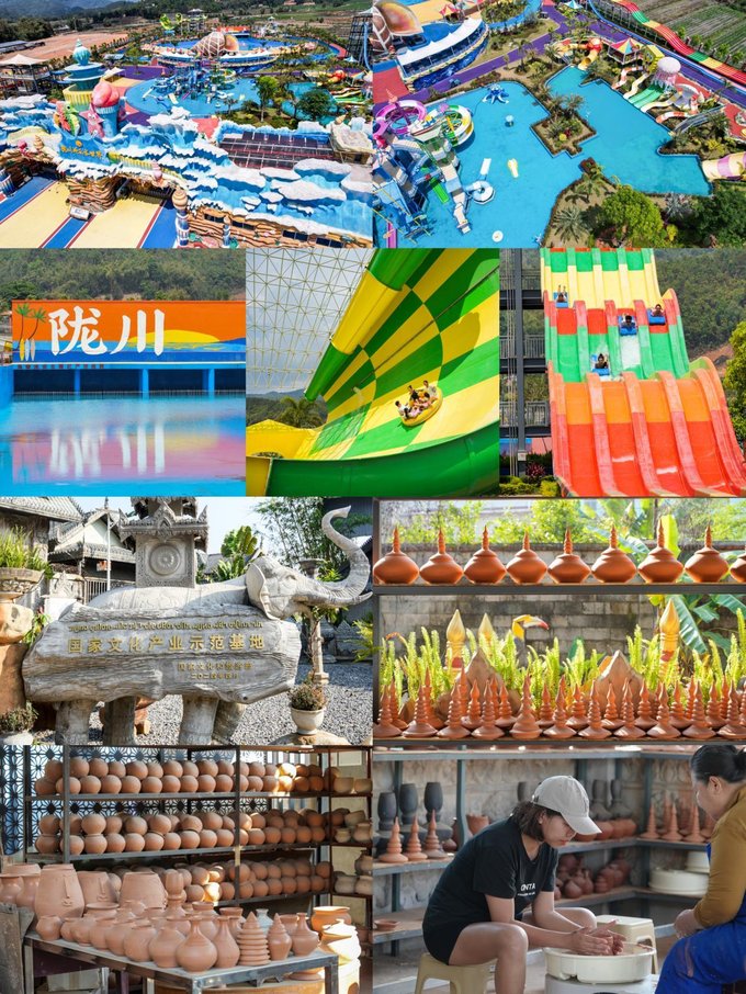 第三站:陇川 德宏的泼水节刚结束,很多宝子说还没玩够水或者没体验到泼水节的。,别担心,五一假期来德宏陇川,这里有超好玩的水上欢乐世界,还有非遗傣陶体验,能让你尽情享受假期时光~ 1、陇川欢乐水世界 这里有超多刺激又好玩的水上项目,适合全家一起游玩 ✔海啸池:逼真的海浪让你仿佛置身海边,享受冲浪的快感�� 喜欢刺激的宝子千万别错过,随着海浪起伏,尽情尖叫吧! ✔深渊滑梯:从高处飞速滑下,感受心跳加速的刺激,胆小的宝子可能会有点害怕,但真的超好玩,挑战自己就趁现在! ✔彩虹滑道:色彩斑斓的滑道颜值超高,从上面滑下来,快乐到飞起拍照也很出片哦,随便一拍都是大片~ ✔落差式环流河:躺在浮圈上,顺着水流悠闲地飘荡,既能放松身心,又能欣赏周围的美景,简直太惬意啦! ✔吊篮滑梯:独特的吊篮设计,让你在滑行中感受不一样的乐趣,小朋友们超爱这个项目~ ✔儿童水寨:各种可爱的水上设施,是小朋友们的专属乐园,在这里,他们可以尽情玩耍,释放童真�� 地址:德宏州陇川县陇把镇龙安村 开放时间:一般4月 - 10月开放,具体可提前查询 门票:单人票198元
