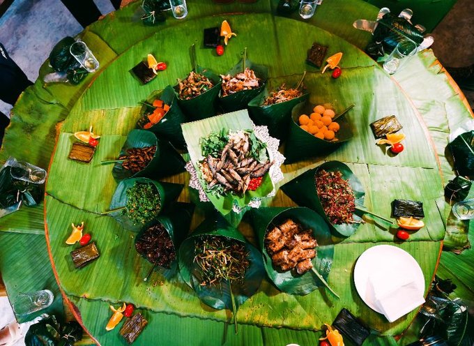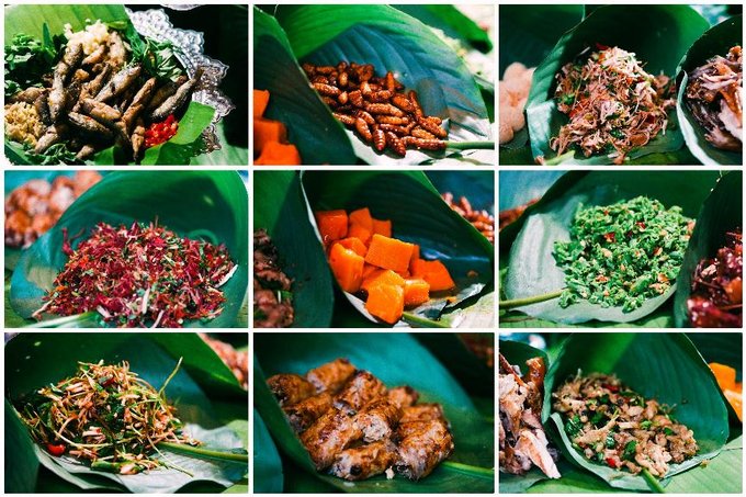 各种叫不上名字的菜肴用芭蕉叶包裹着,琳琅满目,满满当当的一桌。香茅草烤鱼外焦里嫩,撒撇的酸辣在舌尖炸开,味蕾在傣族风味中尽情绽放。