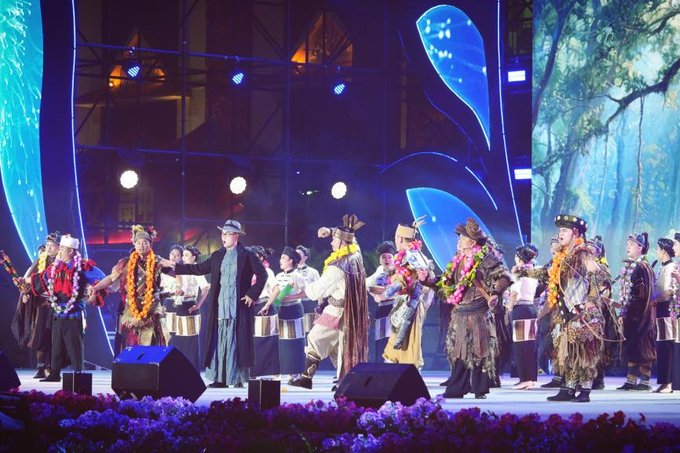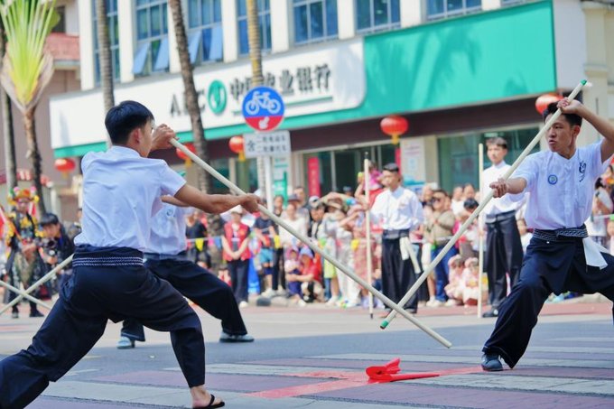 回到市区,芒市广场周边的街道忽然响起激昂的象脚鼓声 —— 中华民族优秀传统文化巡演开始了。傣族的筒裙在阳光下流转着孔雀羽毛般的光泽,景颇族的织锦银饰碰撞出清脆的声响,阿昌族的长刀长棍在队列中划出优美的弧线。 民族的界限在欢声笑语中变得模糊,只留下文化交融的温暖。