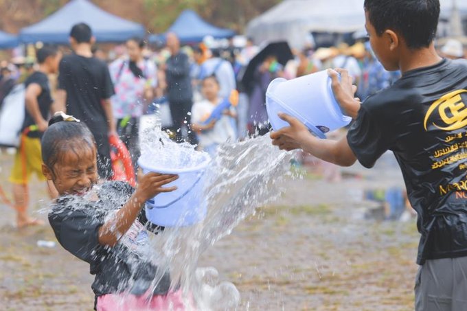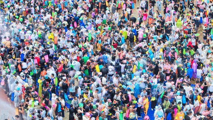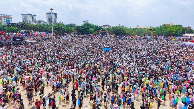 能清晰看见傣族少女提着竹篮穿梭,篮中盛满沾着圣水的赏建草,所到之处便激起一片祝福的水浪;景颇族汉子举着一人高的水枪冲锋,水花在阳光下折射出七彩光晕;更有穿着汉服、JK 制服的年轻游客与当地阿婆互相泼水,传统筒裙与现代服饰在水雾中碰撞出奇妙的和谐。人群中突然爆发出欢呼声,原来是几位缅甸边民举着 “中缅胞波一家亲“ 的横幅闯入镜头,立刻引发周围人用中缅双语齐呼 “水阔(祝福)“,水花如暴雨般砸向横幅,却让上面的字迹在水痕中愈发鲜艳。