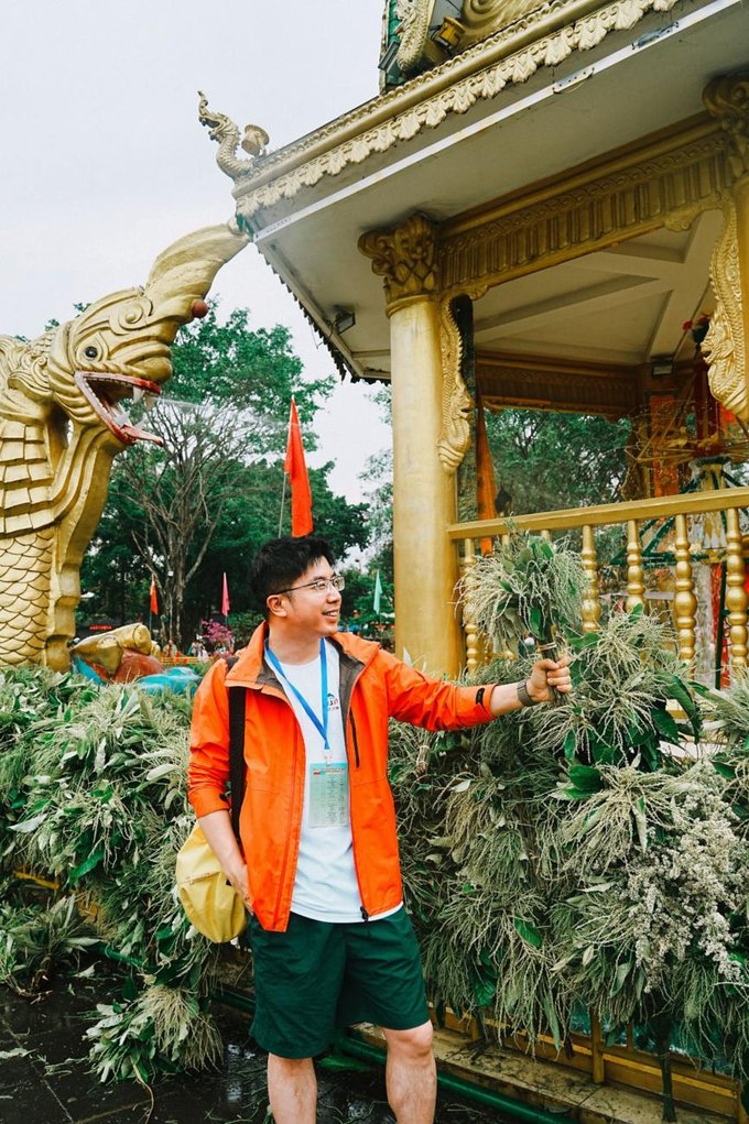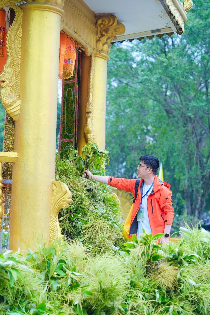 很多人的竹篓里都堆满着半人高的赏建花,德昂族小哥用藤条将草茎捆成束:“泼水节前一天采赏建花,是我们傣家和德昂族的老规矩,龙亭要裹上赏建花编的披风,水神见了才知道人间要过节咯。“ 说话间,他忽然拿起一束赏建花,蘸着竹筒里的山泉水往我额头轻点:“沾点福气,全年不生病。“ 凉凉的水珠渗进皮肤,带着草叶的清香,那一刻,我仿佛真正融入了这场神圣的仪式。