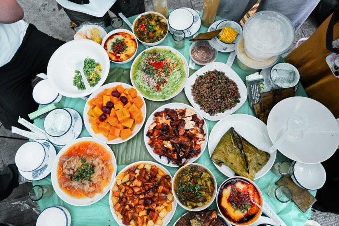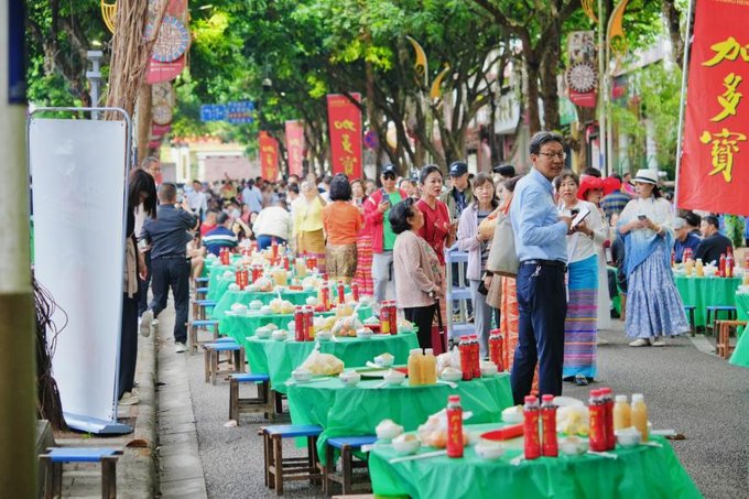 晚饭准备去吃顿民族团结餐。 到菩提寺附近,就立马被眼前的景象震撼了。一条长长的马路,摆满了一个个小圆桌,形成超长的长桌宴。