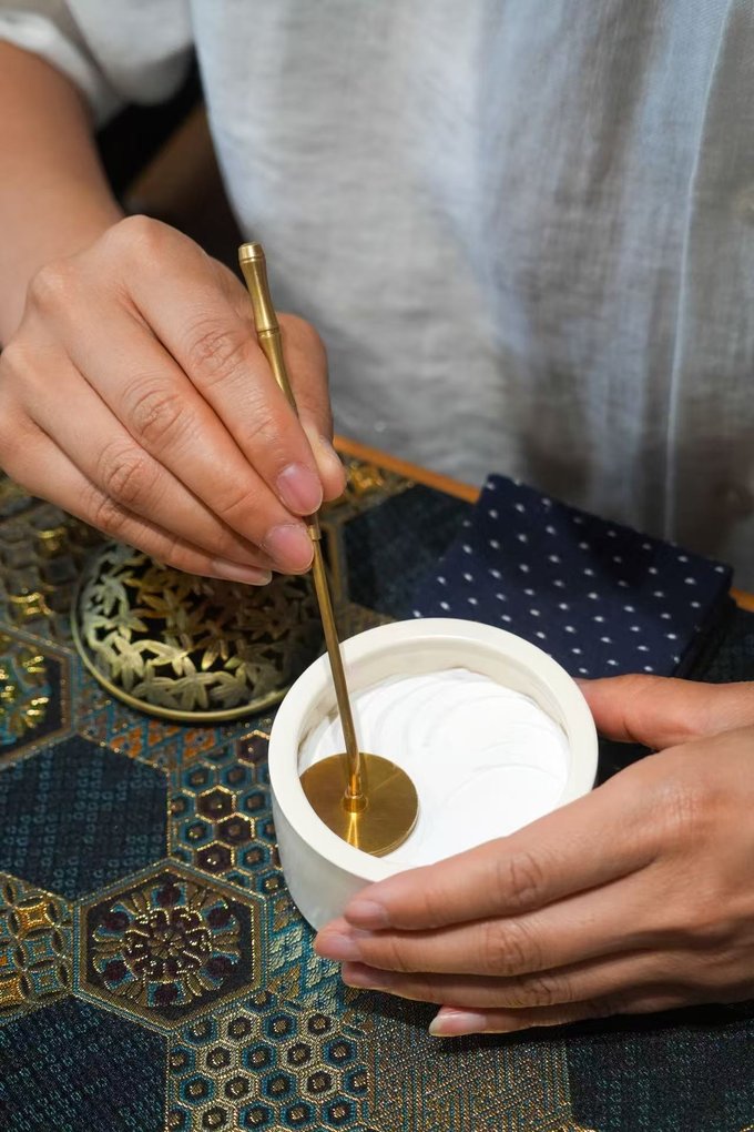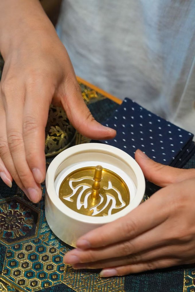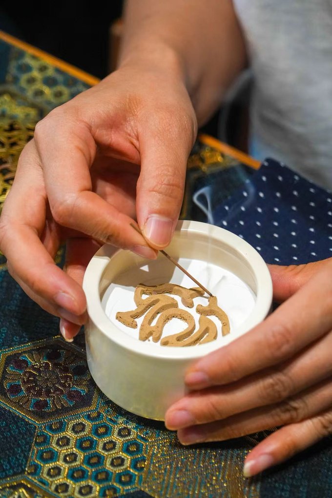 稍作休息之后,就是香道的课程学习。一缕清香、千年传承,它通过把香灰压平整,放入香拓,铺上粉,压实,取出拓后点燃,最难的地方可以说是打拓,稍有不慎便会不平,应静心去浮躁,方可打出好拓。