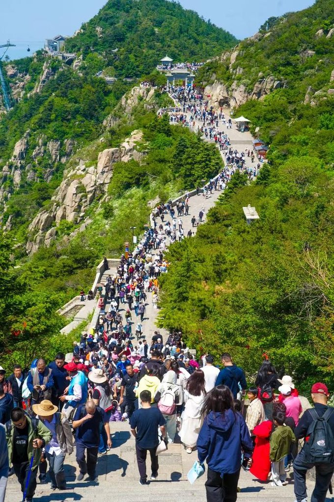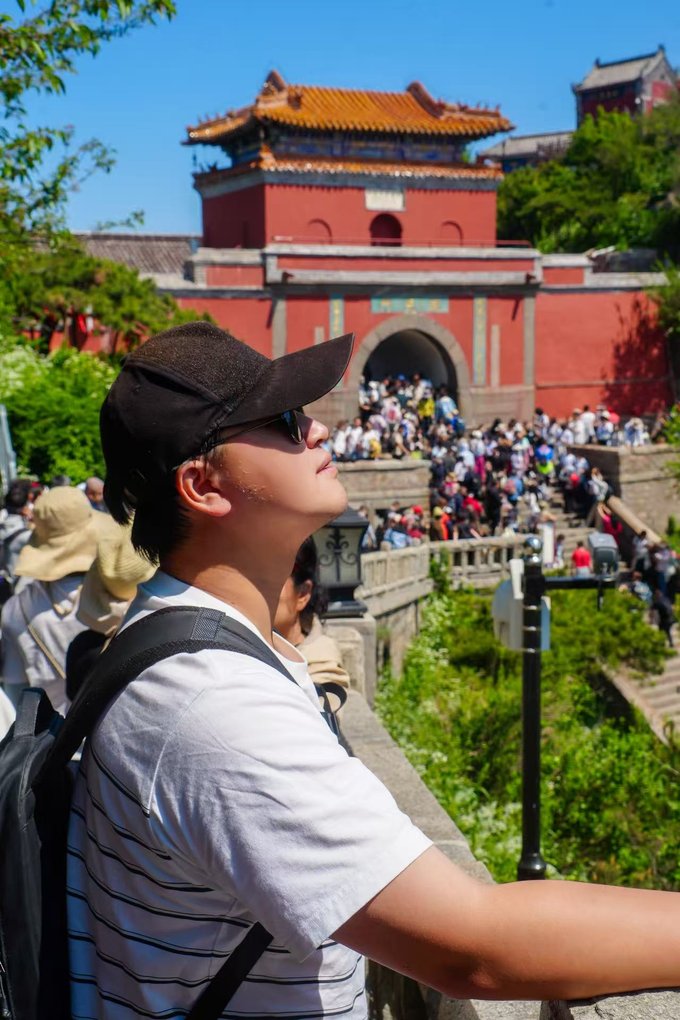️从索道上站出来,步行不远即可到达第一个天门-南天门。这里是十八盘尽头,海拔1460米,泰山最著名的天门,象征“登天之门”,站在门内向外拍十八盘,陡峭的楼梯带来强烈的视觉冲击,云雾缭绕时如入仙境,也是泰山最拥挤的一段,穿过南天门即到天街,可以休息、用餐。