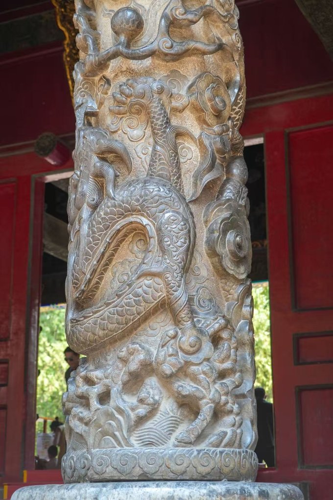 孔庙内有非常多的建筑都很有特色,比如重檐九脊顶的大成殿,殿前10根深浮雕龙柱就为故宫太和殿同款工艺。还有孔子讲学原址杏坛,金代建亭,匾额为乾隆手书。