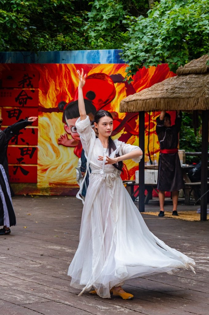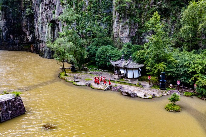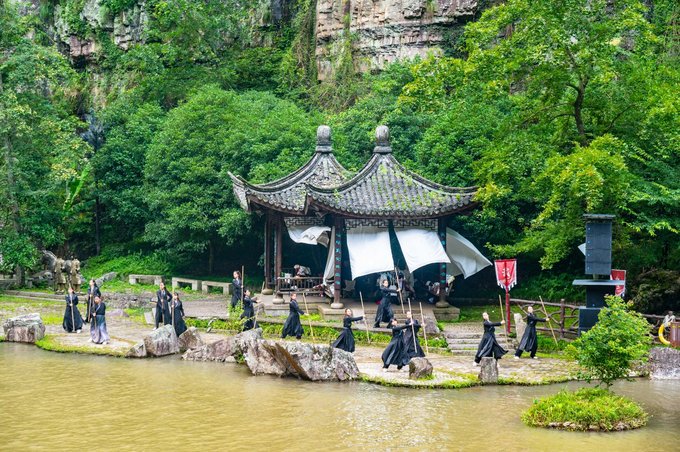 三漈是宽缓水流,落差较小,与周边深潭相映成趣。在这三漈的附近,定时定点还会有一些小的情景表演可以看,可以说是沉浸式的感受“武侠世界”了。