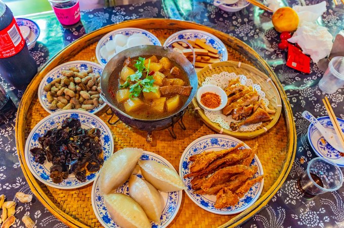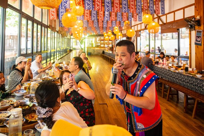 文成 还有一处畲族的聚居地,中午我们就去村子里品尝了畲族特色长桌宴,每四个人就可以坐一张小桌,吃一份套餐,然后桌子与桌子再连起来。除了美食,还有当地的一些民族歌舞表演。边吃边看,加上一些小互动,超有意思。