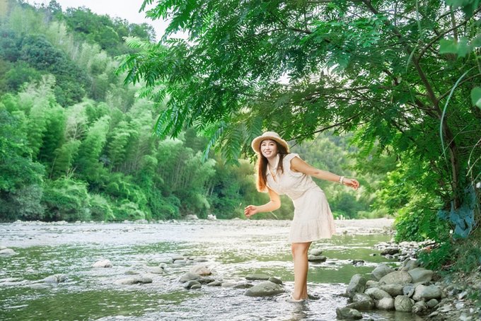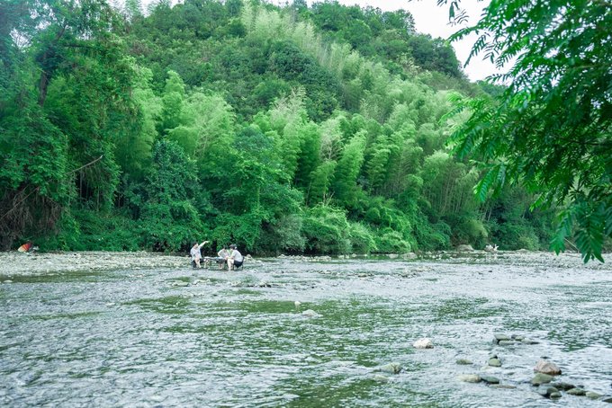 两岸的竹林和阔叶林枝繁叶茂,阳光透过枝叶形成斑驳的光影,落在水里,落在身上,像撒了一把碎钻。