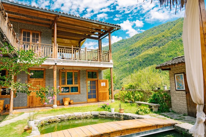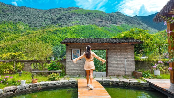 摆着一张小茶几,泡上一壶本地茶,坐在椅子上往外看,能看见远处的山尖和天上的流云。清晨是被鸟叫醒的,拉开窗帘,阳光透过竹叶洒在地上,像撒了一把碎银;坐在院子里的秋千上,所有的疲惫都烟消云散。