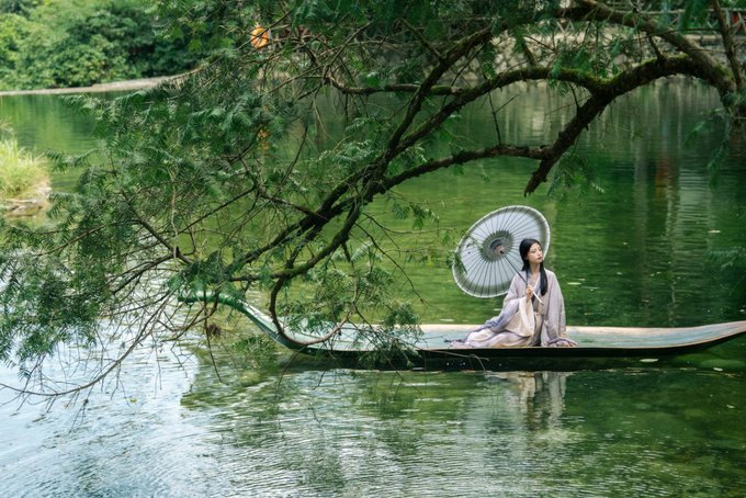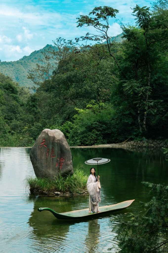 石龙潭水碧绿如翡翠,穿汉服乘一叶扁舟泛湖中,颇有些韵味,让峡谷的清凉浸透每一个毛孔。