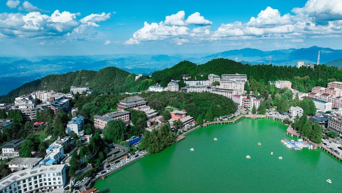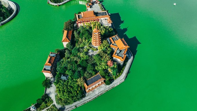 午后的湖面翠绿,这里的时光仿佛是停滞的,没有车水马龙,没有匆匆步履,只有山与湖的相守,人与景的相依。