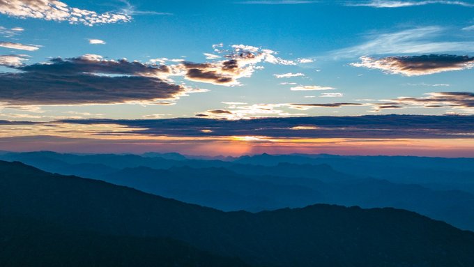 傍晚18:40,太阳开始缓缓下沉,远处的云海里,先是泛起一层淡淡的粉,接着是橘红、橙黄,太阳沉入云海和远山,最后整个天空都变成了"橘子汽水"一样甜甜的颜色。