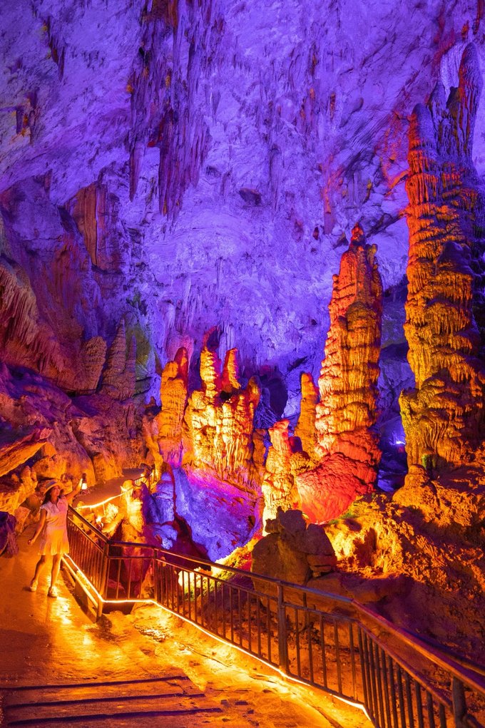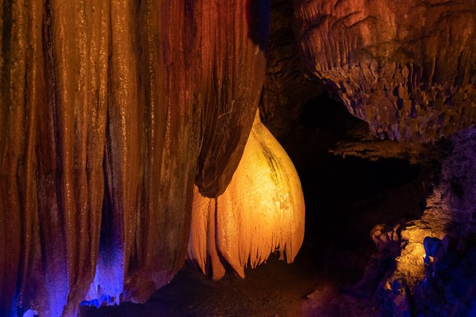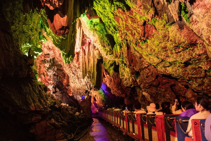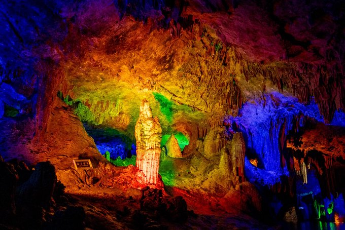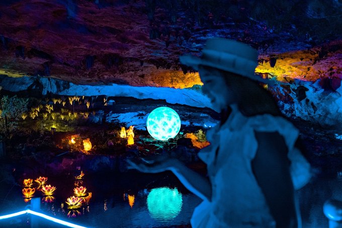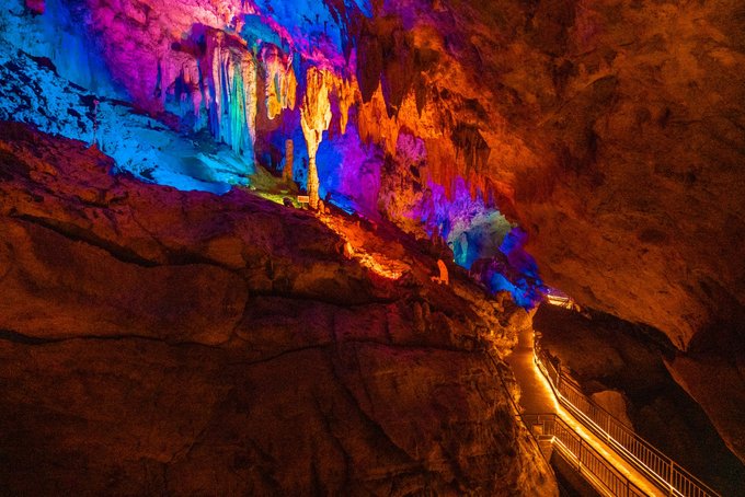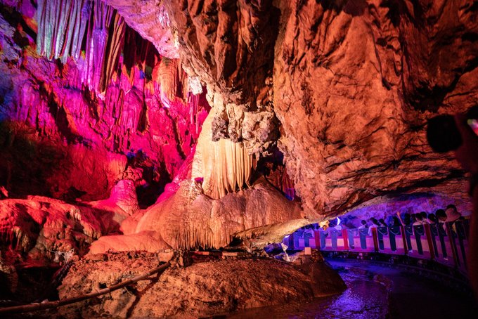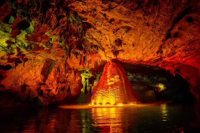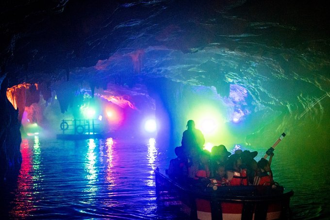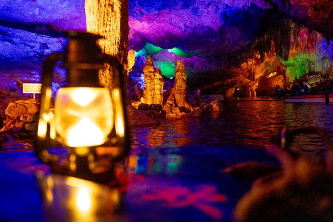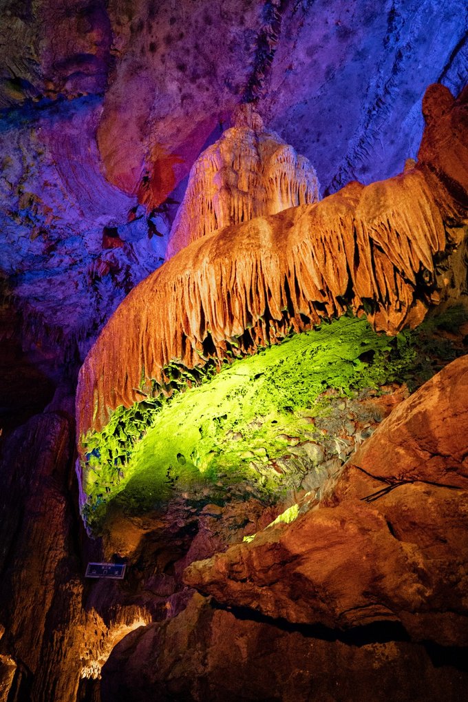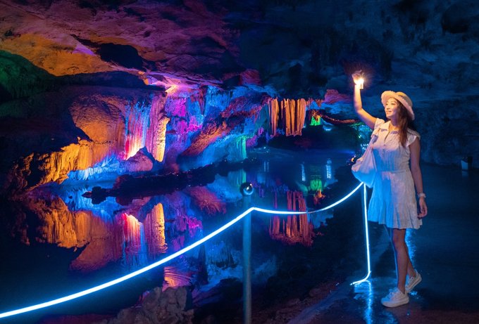 "一洞三游"的体验更是让人惊喜:上游1/3乘舟穿暗河,船夫撑着篙,小船在漆黑的河道里缓缓前行,灯光打在石钟乳上,折射出七彩的光芒。