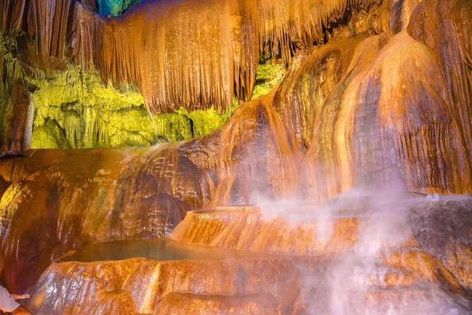 下游1/3徒步,亲手触摸冰凉的钟乳石,指尖能感受到水珠从石笋顶端滴落的触感。这里时而像"仙人田",水声在洞穴里回荡,恍若穿越时空的隧道。