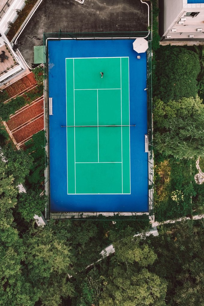 球场周边绿草如茵,树木环抱,空气清新得不像话。穿上运动服,拿起球拍,身后是青山如黛,身前是草坪如茵。挥拍的时候,风裹着松木香扑过来。