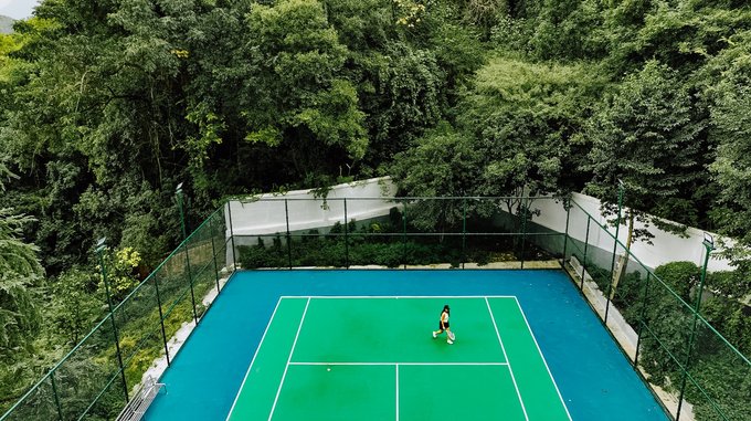 玩累了凤池山,不用急着下山,直接住凤池山酒店就好。推开窗就是林海翻浪,雾气在林间流动。 但最让人意外的,是酒店藏着一个森林网球场!谁能想到,在这深山里,竟有一个按国际标准建设的网球场?