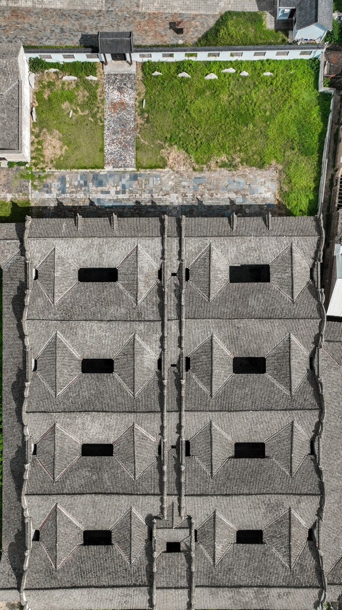 府第以宗祠为中轴线,32天井、64间房呈棋盘格铺展,青石板巷弄如墨线勾勒,从空中俯瞰,整个建筑群就像一个巨大的棋盘,而那些天井、房间,便是棋盘上的棋子。