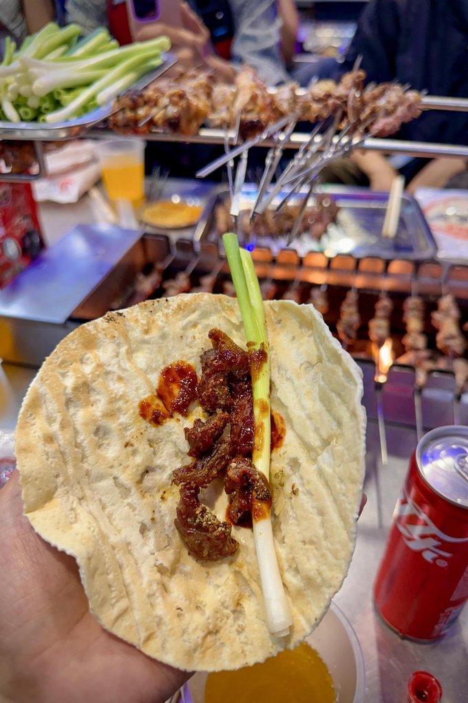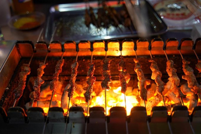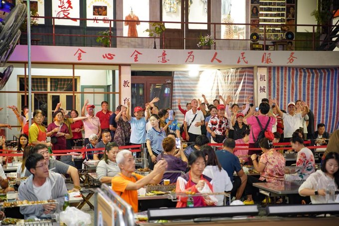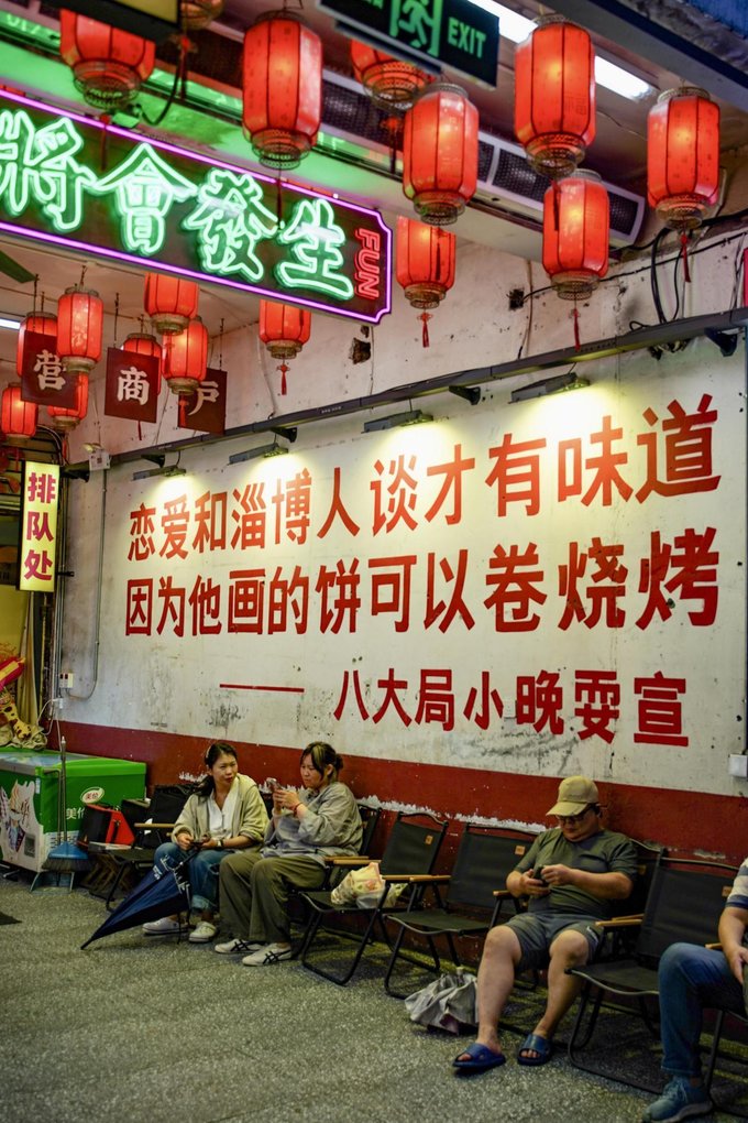 当夜幕降临,淄博的烟火气才真正开始弥漫。我们循着香味来到当地有名的 “小晚耍烧烤” 店,刚进门就被热闹的氛围包围。每张桌子上都摆放着小巧的烤炉,服务员端上新鲜的肉串、薄如蝉翼的小饼和特色蘸料,一切准备就绪,就轮到我们大显身手。大家围坐在一起,一边翻动着肉串,听着油脂滴落烤炉发出的 “滋啦” 声,一边畅谈着生活趣事,没有人在意油渍不小心沾到衣角,爽朗的笑声盖过了周围的嘈杂,这一刻,我们不再是匆匆过客,而是真正融入这座城市的 “临时市民”,尽情享受着属于我们的青春时光。