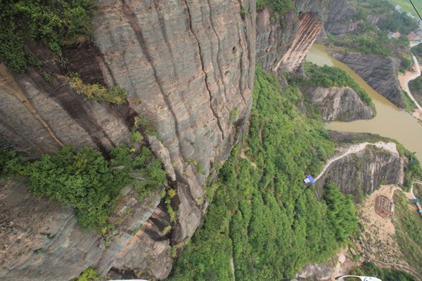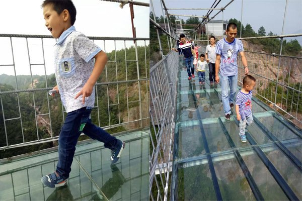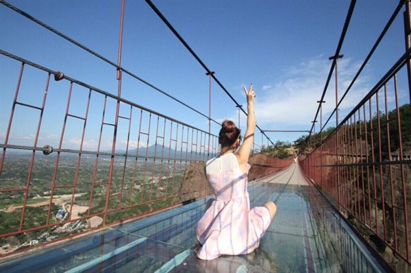 站在玻璃桥的始端,有点小恐高的我并没有任何感觉。向前走了几步,我开始不由自主的往下看,透过透明玻璃,悬崖底下的景物一览无余,让我禁不住去想万一从桥上掉下去怎么办?又一想,我都已经来了就一定要走过去。一步一步的顺着桥体的钢筋移动(万一玻璃坏了,我还能靠着我的平衡感)。快走到桥中间时,我双手紧抓铁索,不敢移动一下,因为越往中间走我感觉桥好像在晃动,晃动的幅度也越来越大。
