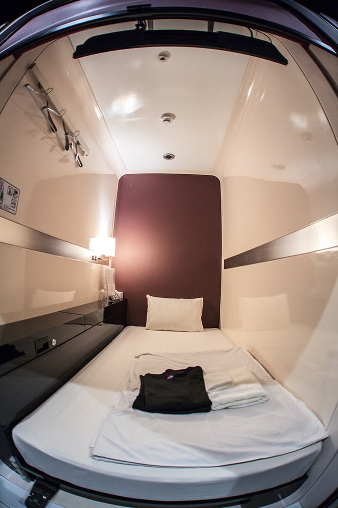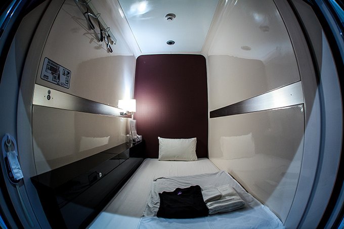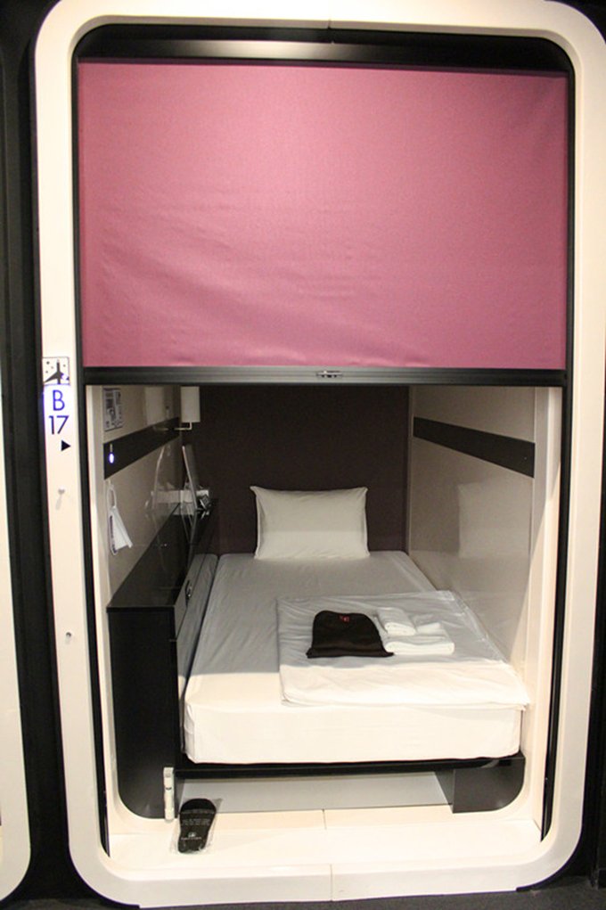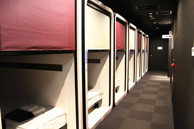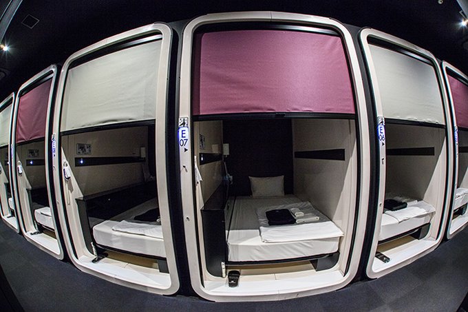 胶囊旅馆大多只有在繁忙的都市地区才有,因为日本可怕的加班文化,促使了胶囊旅馆的诞生。这种旅馆是几十个整齐撂起来的“胶囊”。每个胶囊“盛放”一个顾客。有人说它很像宇宙飞船太空舱,也有人说像棺材。