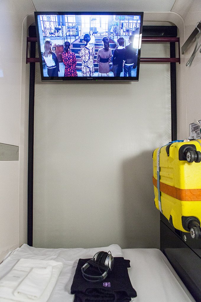 “胶囊”的长宽高分别是2米、1米和1.25米,一个身高1.80米的成年人躺下翻身是没问题的,坐起身来也不会碰到头。一床、一桌、一台电视,基本是内部的全部家具了。袖珍桌子也就门把手大小,只能放眼镜、手表等小物件。墙壁上有一排电子开关,是控制胶囊内灯光、温度及音响设备的。每个格子间还会配有灯,衣架,被子,枕头和牙刷。小电视只能用耳机听声音,因为格子间隔音效果差,就连轻微咳嗽声都能被“邻居”听到。
