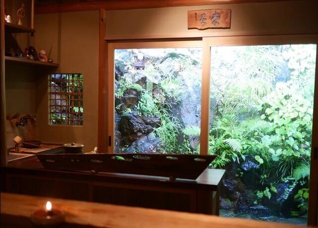 在板前位透过玻璃橱窗可以看到绿绿的日本庭园、还有流动的水。