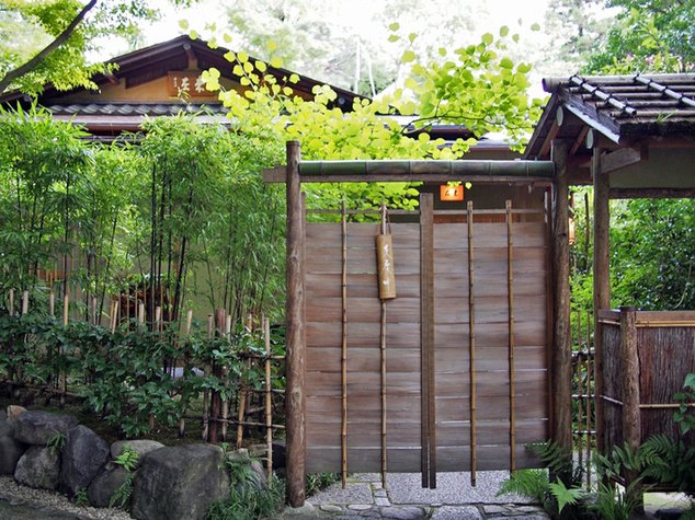 因为料理店的地址就在円山公园,所以提前了一段时间到达,在公园里一边散步,一边等待就餐时间的到来。18点的时候准时开始,但是一般都会提前15分钟就入店,所以真正进店的时间就在17点30分左右。 从面外葱绿的植被环绕下,用竹子分隔开的这块区域就是[末在】。