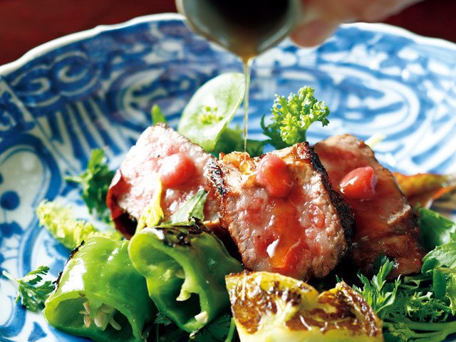 其中印象非常深的就是这道奥出云黑毛和牛的牛腰肉、丹波的香辣的无农药蔬菜、万愿寺唐辛子组合在一起料理。配合使用日本本土的蜂蜜制成的葡萄酒风味的醋食用,可以说这道料理中的牛肉正是体现了石原先生不断追求高品质的原则,牛肉的究极美味。