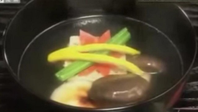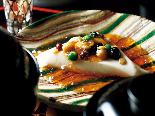 一道非常漂亮的豆腐料理端上来了,这道料理让糯米开始注意到石原先生所使用的料理器皿了。不管是颜色,还是造型这个盘子和这道料理的配合简直是让人无话可说。味道和口感上,豆腐的柔软和豆子的口感完美的结合。虽然没有太过奢华的材料,但是这道料理绝对可以打满分。 在这段时间石原先生一直都在我们眼前做菜,每上一道菜都会说上一句[请慢慢享用】。然而在茶碗将要出来之前,石原先生会前往厨房对要出场的主汤进行微调。