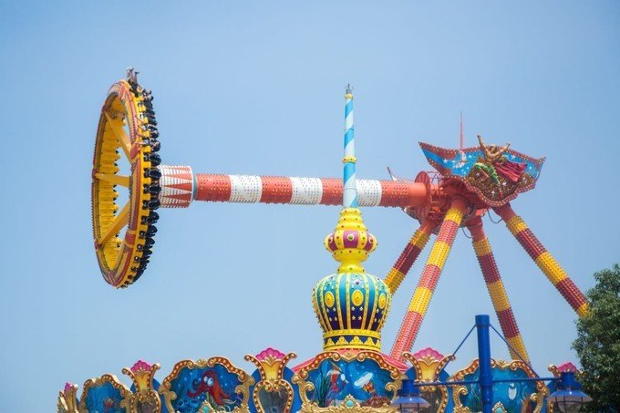【波浪翻滚】 当转臂与摇臂反向转动时,轿厢是在空中作扭麻花运动,360度的旋转你能不晕么?哈哈