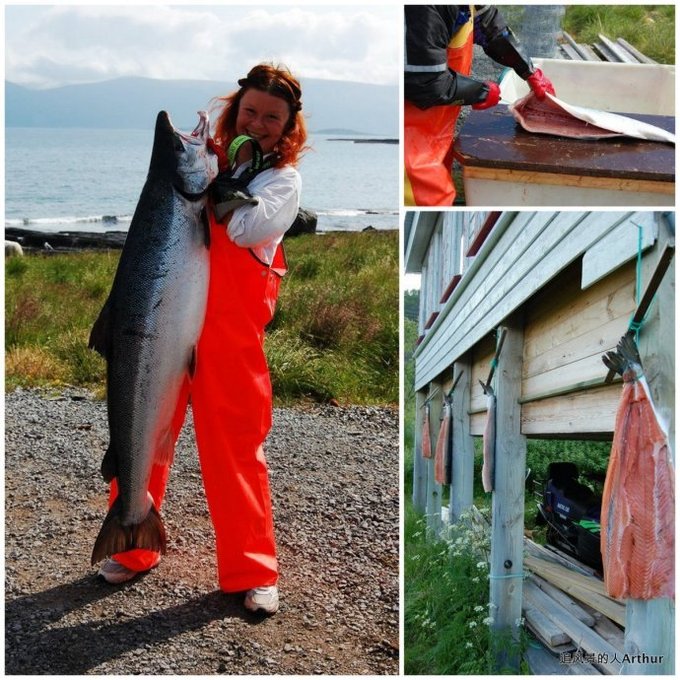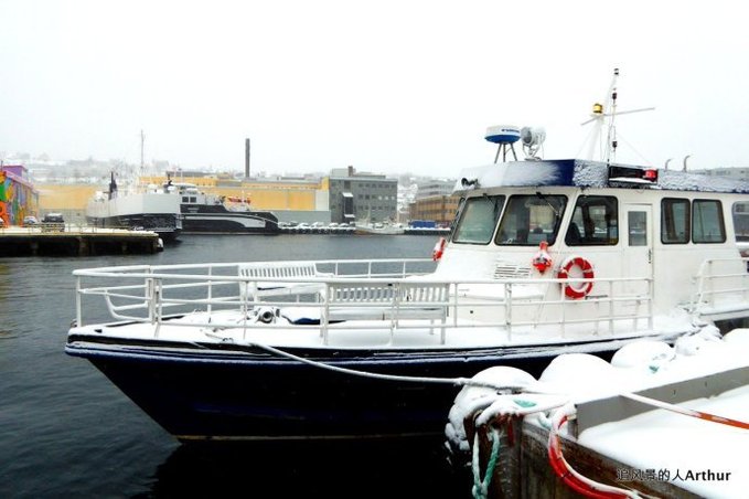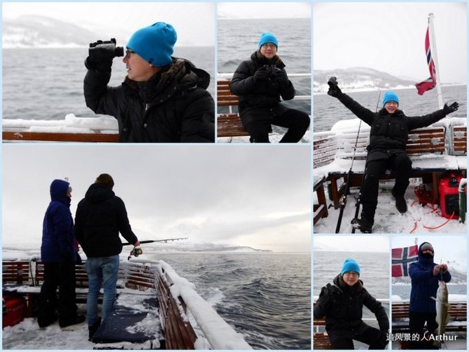 在随后的数个小时里我们就一直在峡湾里行驶。因为天气实在是不好,风浪太大不能去深海。虽然后来雪停了但天空还是阴沉沉的。待船儿驶进了一个相对宽阔的峡湾,我们抛锚用海杆钓鱼,我学会了快速左摆慢慢右放的钓鱼动作,就是为了吸引海里的鱼儿上钩。我装模作样的摆弄了半天,竟然钓上来一大团不知名的海藻,最后还是在小伙子的帮助下我们钓上来一条足有半米长的一条大鱼,在后来归航的路上又钓到一只一尺长的,我负责收线将鱼拉上来,颇有成就感啊。 遗憾的是最终没有看到鲸鱼。好在在4小时的海上飘荡并不寂寞,那个叫Marlene的大姐一路上给我们讲故事唱歌,看她们以前出海拍到的照片。大家喝咖啡聊天,时不时跑到甲板上寻觅鲸鱼的踪迹,几次一惊一乍的以为看到了鲸鱼,热热闹闹的还是蛮开心的。 返航后待船进港停下后,Marlene请我们吃好吃三明治和汽酒,可能是安慰我们失落的心情吧。