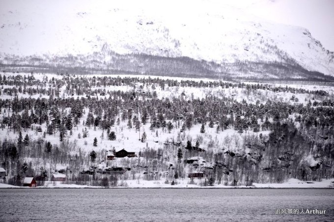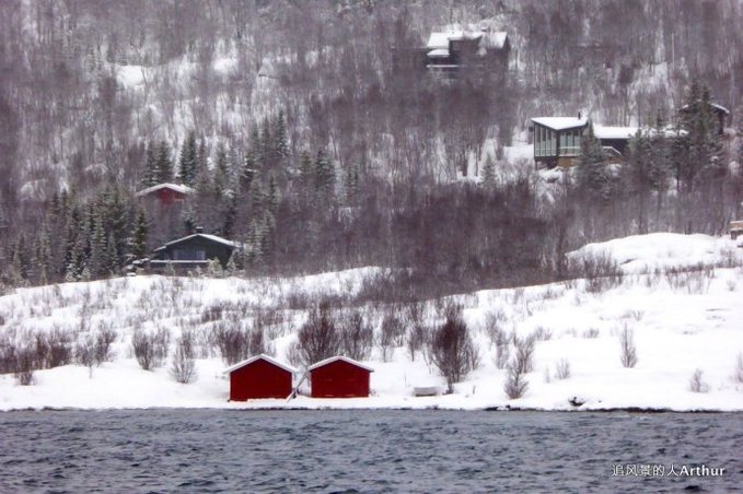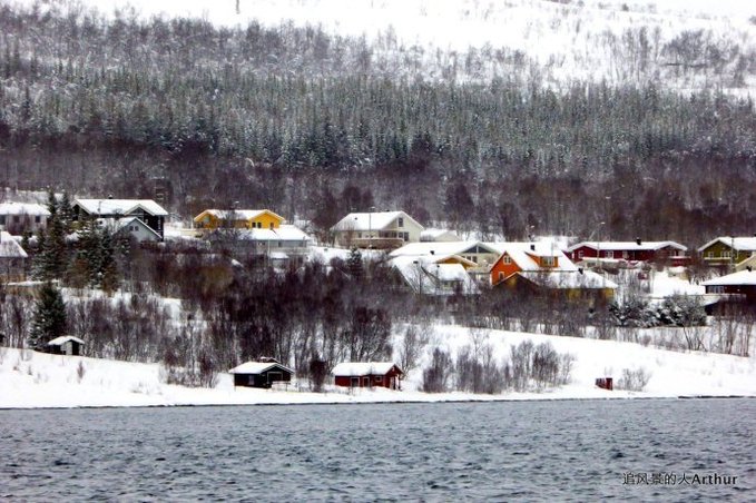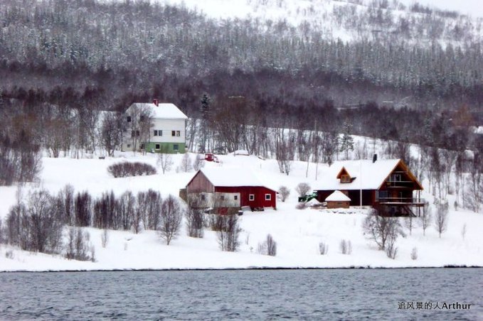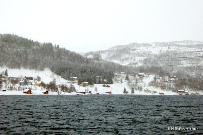 行进在峡湾里两岸是白雪覆盖的山脉和森林,点缀在山间的房屋五颜六色,现实里的童话。