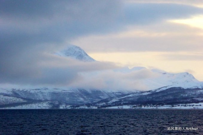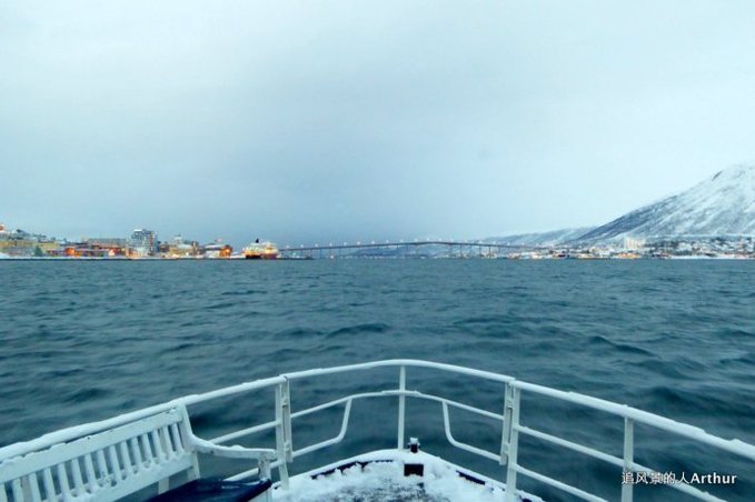 四个小时后返航了。北极圈内的特罗姆瑟天黑的早,不过3点钟左右岸边的房屋就点起了灯火。