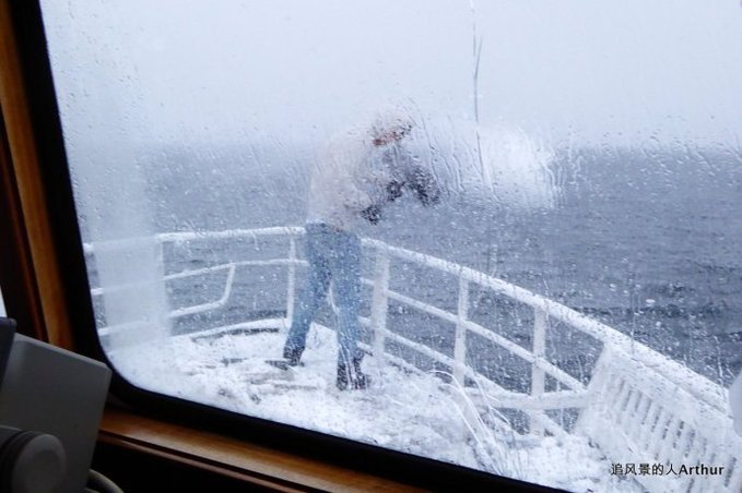 起航后小伙子冒着刺骨的冷风在风雪的船头铲雪,真是很危险的。