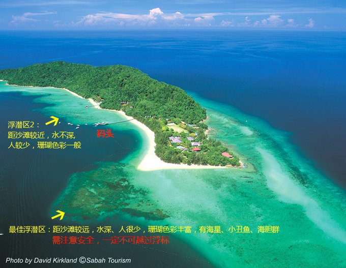 本张照片是在沙巴旅游局网站查找到的,为了让更多朋友发现马奴干岛的动人之处,方便不熟悉的朋友找到这片区域,文字和标注为我自己添加。需要注意的是,浮潜也存在危险性,一定要注意安全,不可越过浮标区域,建议与多个同伴同行。