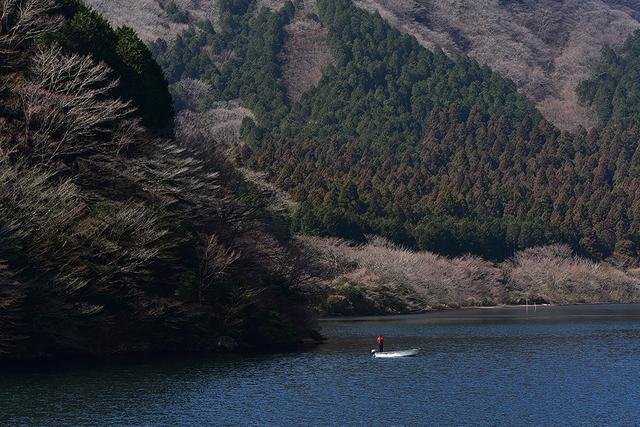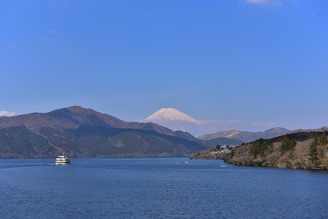 ▲三月的芦之湖风和日丽,湖水湛蓝。芦之湖是箱根山在约3,000年前喷火时产生的环湖约20㎞的火山湖,位于箱根町的西部,箱根山麓,是神奈川面积最大的湖泊。