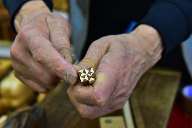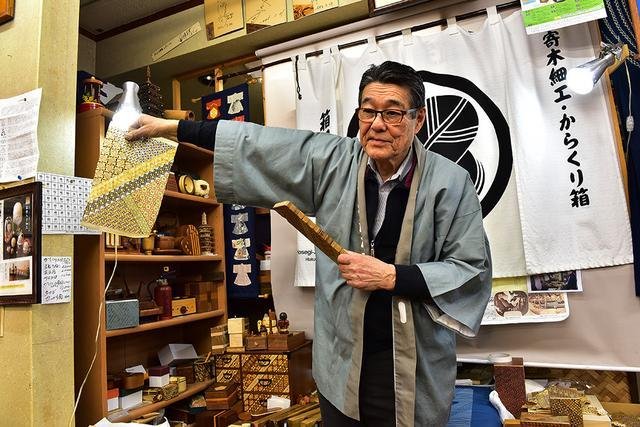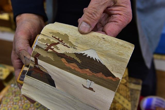 ▲馆长告诉我们,寄木细工是非常复杂和精细的手工艺,要做到独当一面的匠师,起码要10~20年。这也难怪当下的箱根乃至日本,导致无论是寄木细工作品产量还是从业人数都算不上丰富,而要思考如何面对日新月异的社会发展和现代消费者的品味,设计制作出符合时代的产品,也是对匠师和他自己的考验。不过,从这位和蔼的老人的笑容和他斑驳粗糙的手指中,我也读出了从事这一行的艰辛。