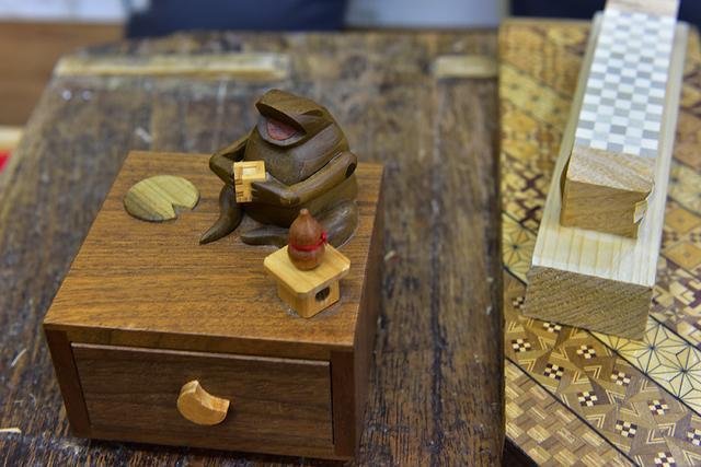 ▲ “寄木细工”起源于日本的江户时代,其中最有名也是我觉得最好把玩的部分要属“秘密箱”,表面纹路完全是它的伪装,内里的机关才是让人”伤透脑筋“的根源。这种盒子的开启方法十分独到,必须按照精确的步骤才能最终开启。少则几道,多则需要二十几道的程序才能打开。比如上面那个“喝酒的青蛙”的盒子,下面的抽屉并不是那么简单的一拉打开,而是先要拿酒壶给青蛙手中的杯子斟酒,然后把酒壶放在左上角的荷叶上,这才算“机关”全国,拉下面的抽屉把手,才能打开盒子。馆长还相当娴熟地演示了好多奇特的盒子,和各种打开机关,让我们大开眼界。
