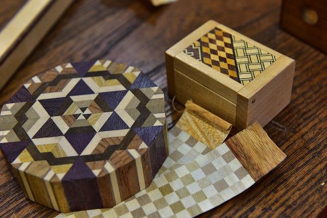 ▲最有趣的当然是自己亲手制作了这样一个小型的秘密箱啊!看着自己也能将一块一块的木头片在工作人员的指导下拼成一个4道机关才能打开的秘密箱,然后再贴上漂亮的几何图案寄木细工,然后用砂纸磨平边角,像模像样的作品出来后,还真的小有成就呢。手工制品都算不上便宜,秘密箱的确是比较值得入手的物件,虽然实际用处并不大,不过却可以把玩很久……