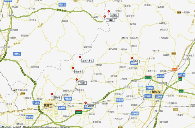 七贤村——河南行(修武县)5【原创】 我们离开万仙山,驱车南下,经辉县往西南至修武县。 下面这张图将有关的几个地方及景点都列上了。