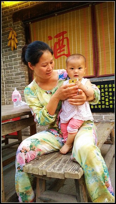 商家媳妇给自己的孩子玩手机,用手机给拍几张人家还挺配合。