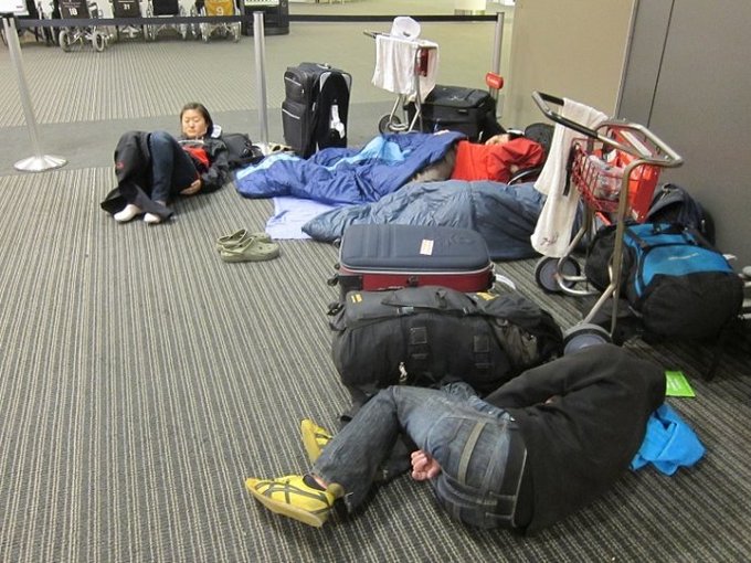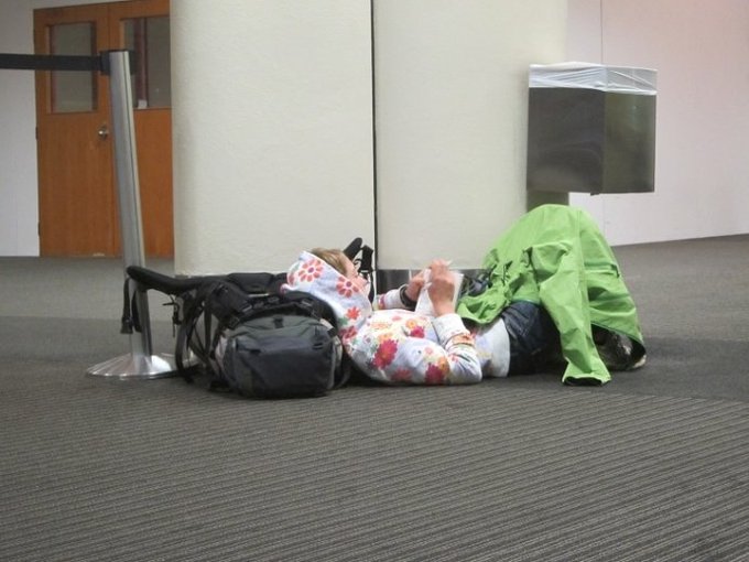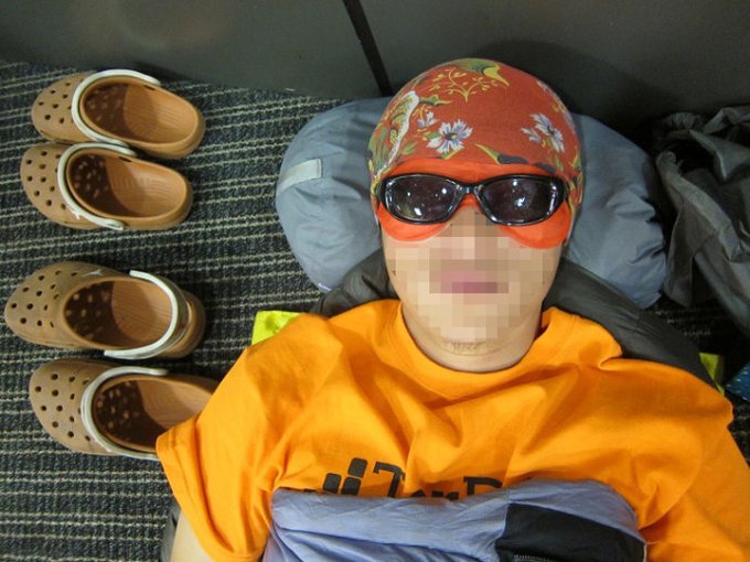 座位上不让睡,所以睡觉区开放后就主动移过去吧, 可以抢占有利地形,特别是行李要靠墙放,拴在一起,比较安全。候机厅灯是不关的,所以要睡的好,可以戴眼罩,我发明的“眼罩侠”装束,